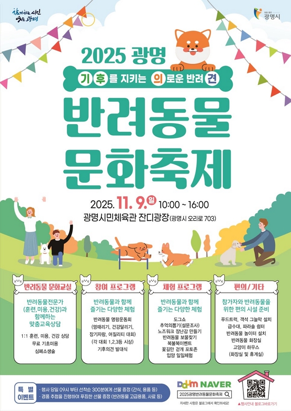 📜반려동물 문화 교실이 열리며, 훈련사, 미용사, 수의사 등 반려동물 전문가에게 맞춤 훈련, 건강 상담, 기초 미용, 심폐소생술 교육을 받을 수 있고요. 현장 신청을 통해 참여할 수 있는 ▲ 반려동물 운동회(건강달리기, 멍때리기, 어질리티) ▲ 반려동물 장기자랑 대회(너의 끼를 보여줘)도 열립니다. 이 외에도 입양 체험, 반려동물 보물찾기 등 다양한 프로그램이 무료로 운영되며, 잔디광장에 설치된 반려동물 전용 놀이터도 자유롭게 이용할 수 있습니다. 사진 광명시 |