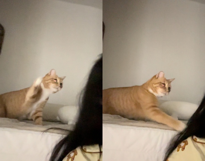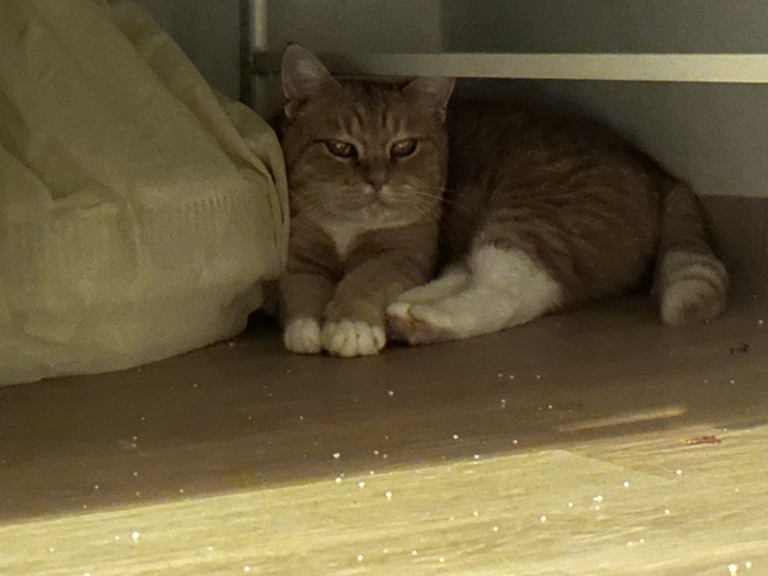 지금은 정말 많이 가까워졌어요!👏 제가 침대에 있으면 심심하다고 밑에 앉아 빤히 쳐다보고, 옆에 바짝 붙어있어도 하악질 안 하고 참아줘요. 물론 아직도 손대면 엄청 성질내긴 하는데...😂 이 정도 거리감이면 이제 '같은 반 친구' 정도는 됐다고 생각합니다.